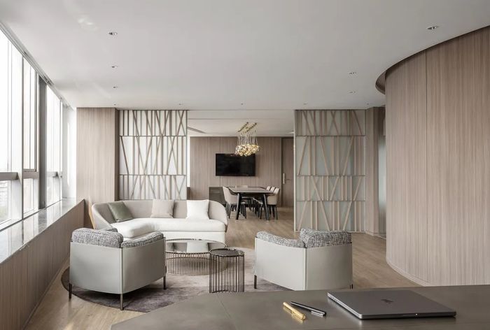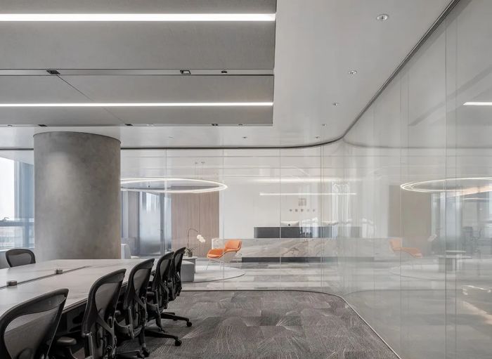 通過采用以灰色為主的色彩搭配,結(jié)合空間規(guī)劃的巧妙設(shè)計(jì),成功營(yíng)造出一種具有江南水鄉(xiāng)特色的濕潤(rùn)、朦朧美感,突破了大廈原有條件對(duì)空間設(shè)計(jì)的限制,并將這些不利因素轉(zhuǎn)化為空間中的亮點(diǎn)。該設(shè)計(jì)方案不僅體現(xiàn)了高品味和舒適度,還展示了設(shè)計(jì)師對(duì)于空間氛圍深刻的理解和獨(dú)到的藝術(shù)見解。