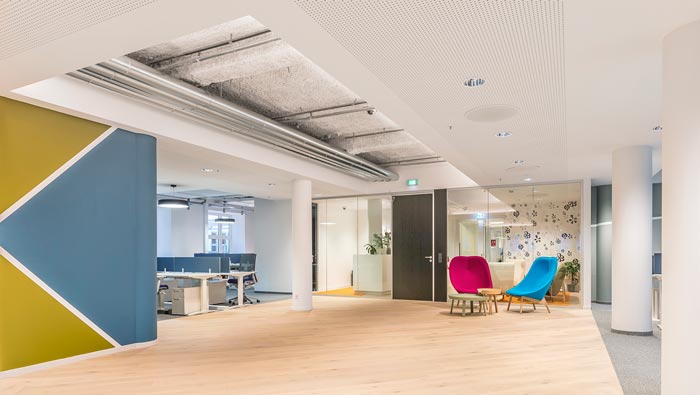 辦公區域的設計:因為空間本身有一些柱體存在,且無法去除,在此基礎上設計師利用色彩、材質的不同,以柱體為分割點將空間一分為二,但是在兩個空間之間卻沒有實體的任何材質,這也是設計師的高明之處,這樣一方面去除了柱體對于空間的影響,同時空間的通暢性也大大提升。