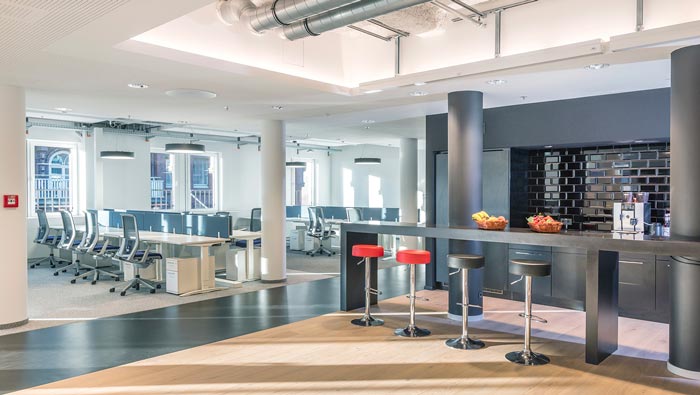茶水間的設計:此處位于進門區域的隔斷墻之后,也是進入內部空間的必經之路,由于此處位于兩個辦公區之間,故此將茶水間安置在此處,吧臺在裝修的時候就將柱體包裹在其中,目的就是為了弱化柱體對于空間的影響,同時也是為了將空間開發到極致。