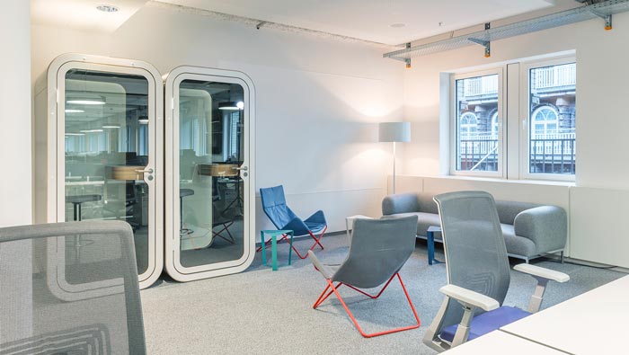 休息區域的設計:在休息區域的設計中,設計師并沒有固定一個獨立的空間,而是在辦公區域的后方留下了一篇活動區域,在這里最引人矚目的就是兩個長方形的柜體,這樣的柜體主要作用就是封閉的打電話柜,當員工有電話的時候可以在這里面進行接聽與交流,在保證通話的同時,也不會對外界有任何影響。