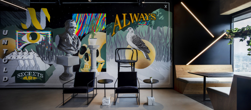 辦公室的正門會帶你到休息室和就餐區。一幅巨大的墻壁藝術畫決定了休息室的空間,而黑色的框架定義了對角線的食客,旁邊是一個充滿種植園的窗戶。