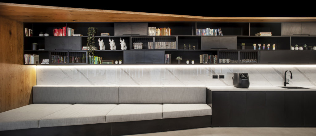 廚房里有一個長長的裝飾性圖書館和一個瓦斯沙發,供員工們放松一下。