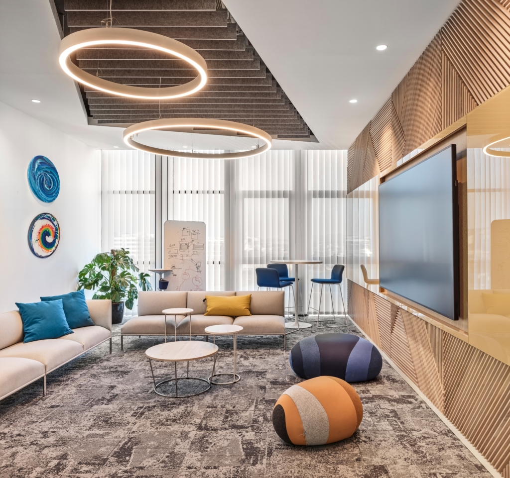 在建筑公司身份的啟發下,3D三角圖案被用作封閉房間的墻壁覆蓋物。在非正式會議室,各種舒適的座位和工作風格的選擇為員工創造了許多選擇。