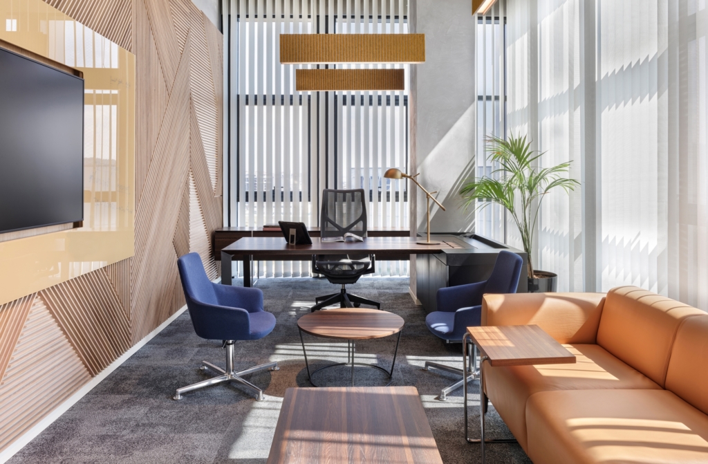 該配色方案的靈感來源于建筑師的企業身份、藍色色調以及煙草、灰色等互補顏色,在整個空間中保持平衡。