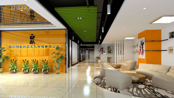 前臺的設計,設計師將區域一分為二,以門為中小心,一邊展示企業品牌形象,一邊是接待區域,將空間利用到最大化。