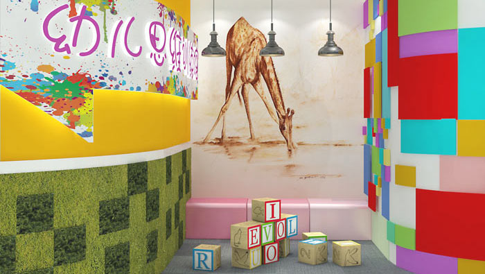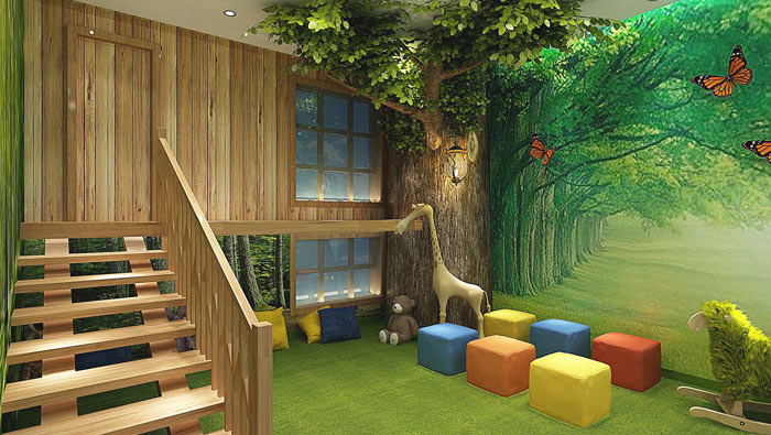 玩耍區域的設計:設計師在設計的時候,將大自然搬入室內,讓孩子可以在這樣的空間中不斷的開拓自己的想象能力,讓孩子可以無時無刻的受到自然的熏陶,設計師希望為孩子打造一個無壓力、無負擔的空間,讓他們在其中無憂無慮的成長。