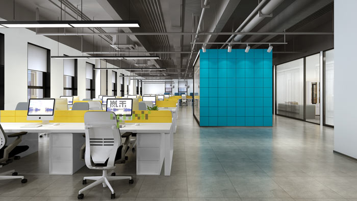 科技公司辦公室辦公區設計:設計師為了在辦公區開辟出一個交流區,故此將空間按照5:5的比例對空間進行劃分,設計師將交流區設置成獨立空間,以動線將空間加以劃分,做到分合有序。