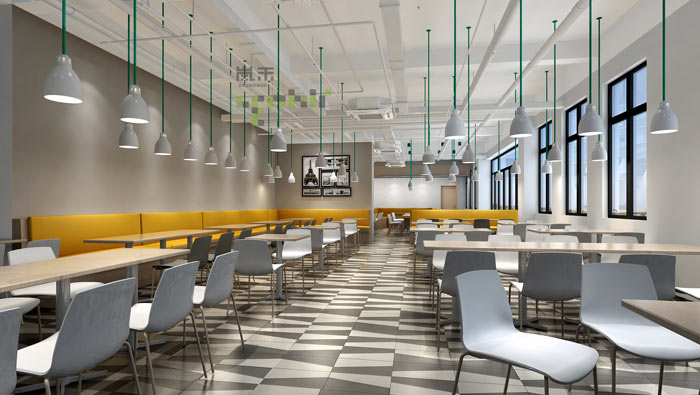 科技公司辦公室餐廳設計:企業有自己的餐廳,這里是員工集聚的場所,故此設計一定要考慮到實用性,簡潔、明亮的空間讓大家在這里安心就餐,同時相互交流、彼此攀談。