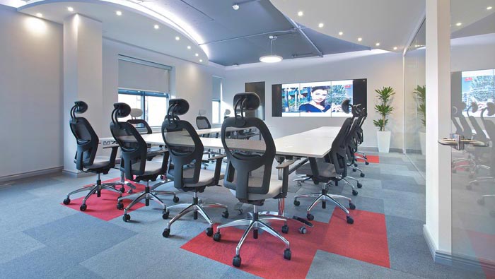 科技公司辦公室會議室設(shè)計:設(shè)計師在設(shè)計的時候,為了保證空間的人性化,故此在會議桌的選擇上面采用新型的U字型會議桌,這樣設(shè)計的好處就是為了培養(yǎng)員工的講述能力,中間的空位位于空間的中心點(diǎn)之上,為匯報著、講解著提供了更多的活動空間。