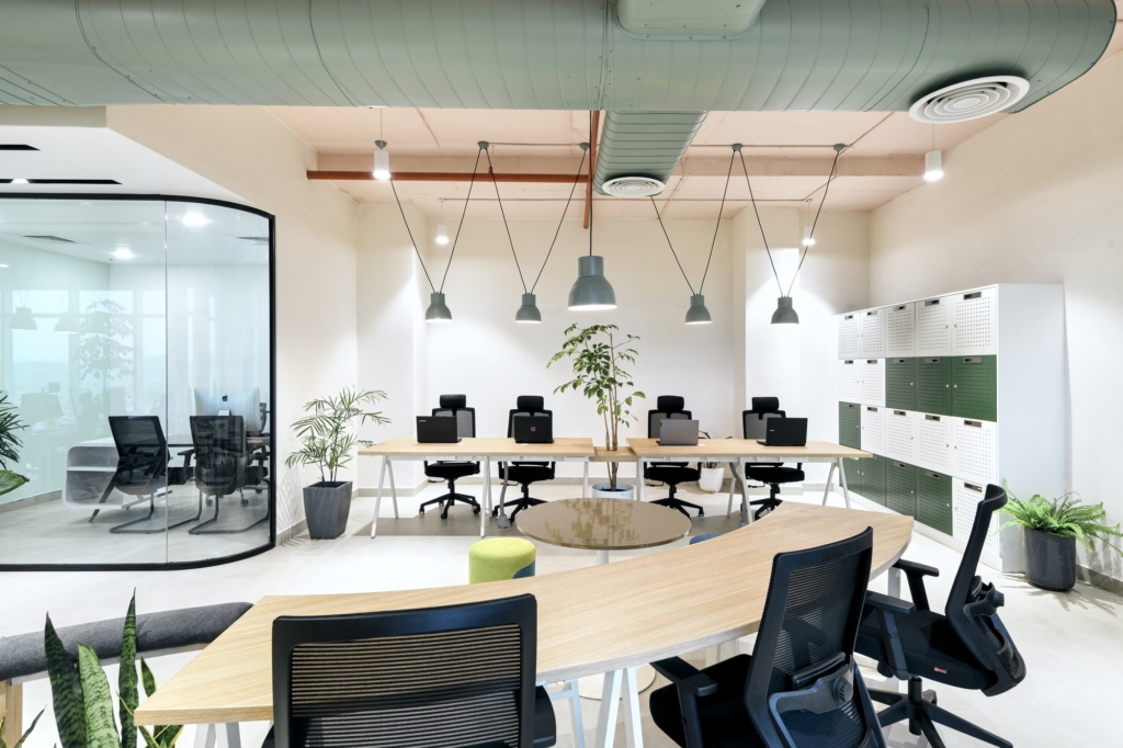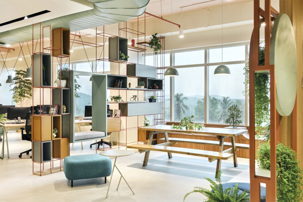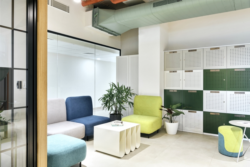 員工可以根據(jù)自己的活動(dòng)選擇自己的工作站;除了個(gè)人工作站、放松的海洋、私人的盒子、頭腦風(fēng)暴區(qū)、討論區(qū)、野餐桌等,還可以通過(guò)隔墻系統(tǒng)將這些房間與開放式空間隔開。毗鄰的討論區(qū)是設(shè)有玻璃墻的儲(chǔ)藏室,可以看到植被茂盛的外部環(huán)境。個(gè)人存儲(chǔ)是我們客戶的要求,我們認(rèn)為,使櫥柜與內(nèi)部相匹配,也有助于優(yōu)化辦公室存儲(chǔ)空間,提高辦公效率,并為員工提供一個(gè)安全的存放個(gè)人物品的場(chǎng)所。