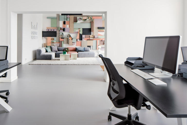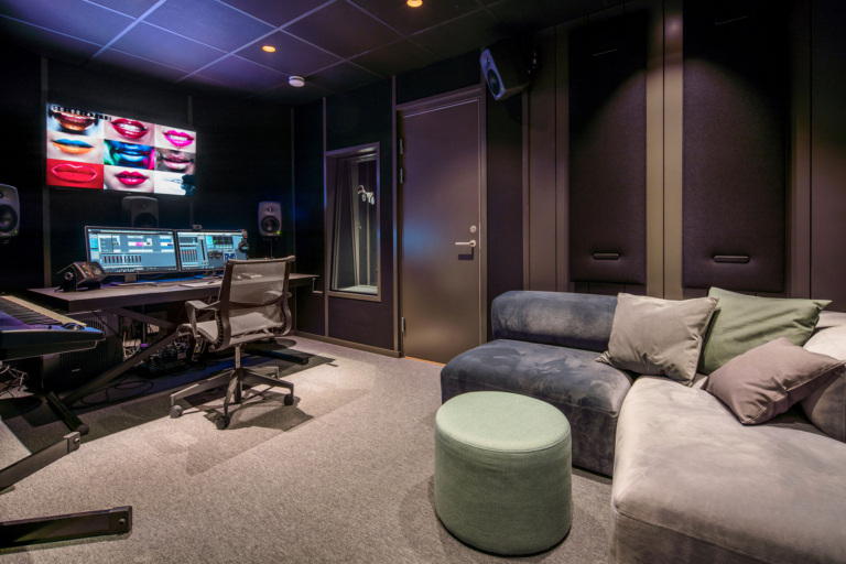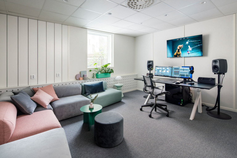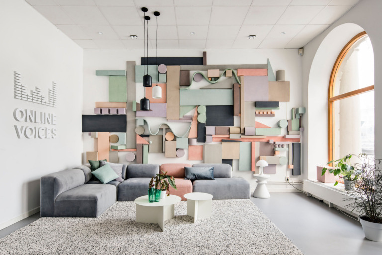 一種新的和創(chuàng)造性的方式使用聲學(xué)面板、穿孔金屬和金屬網(wǎng)。研究了聲音及其背后的技術(shù),并在整個辦公室的色彩、形狀和材料方面運用了這一靈感。在休息區(qū)的墻壁上,創(chuàng)造了一個帶有彩色音響面板的裝置,以及一個混合控制臺按鈕的靈感設(shè)計。類似的細節(jié)可以在辦公室里找到,也可以找到設(shè)計的其他東西,比如一盞聲波形狀的燈。