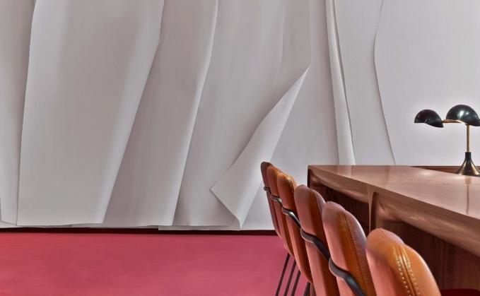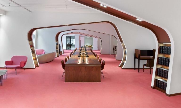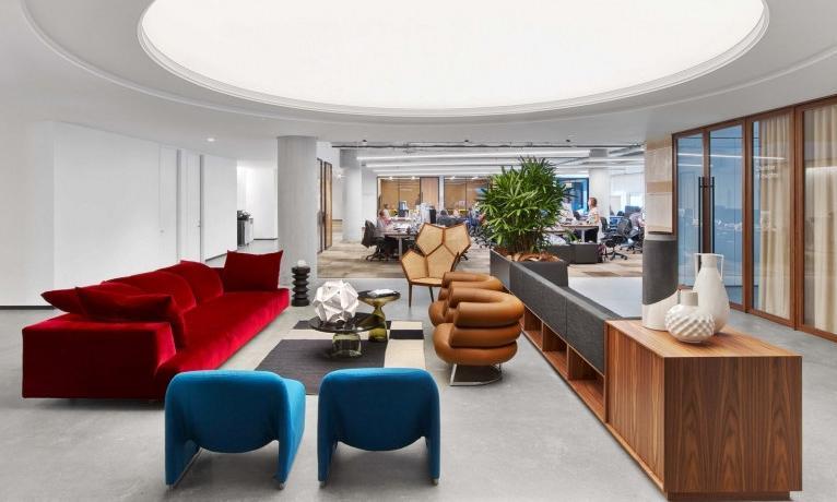 這次來帶一家計算機存儲公司辦公室裝修設計案例,空間面積1020平方米。靈感來自一個模糊的,70年代的意大利劇院,它到處都是圓角和毛絨地毯,是退卻閱讀或發(fā)送電子郵件的理想選擇。