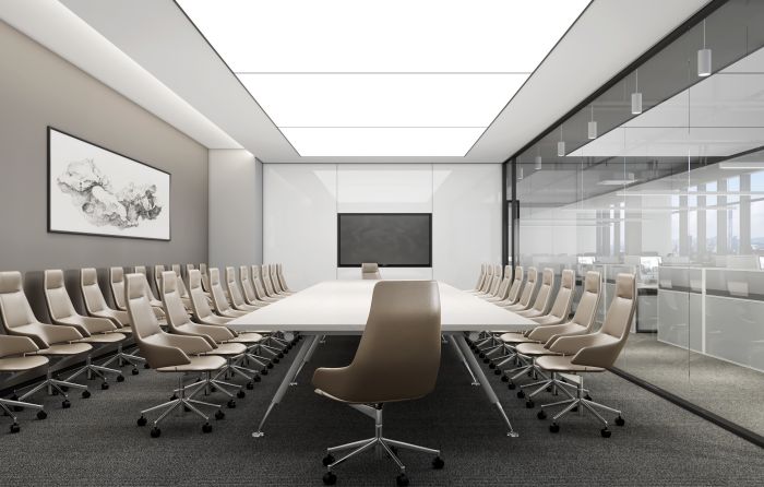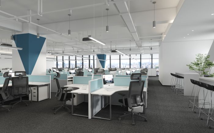 這是一家電子制造業公司辦公室裝修設計案例,空間面積900平方米。設計以公司標志為靈感,使用了標志的顏色和結構,并且融合在平面設計和家具配置中。