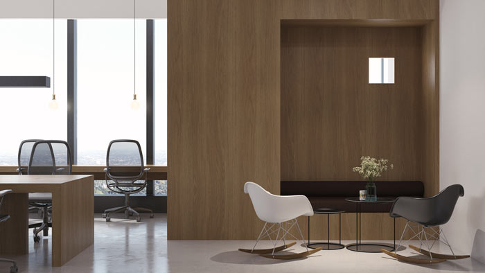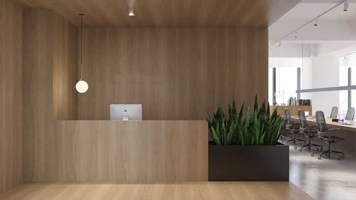商貿公司辦公室前臺設計:前臺的墻、頂、地全部由木材裝飾而成,這樣可以將前臺設計成一個整體,這樣的設計模式與企業的運營模式相同,一體化的設計提升了企業的專業度。