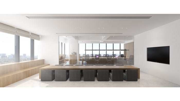商貿公司辦公室會議室設計:高坐有高坐的優勢、低坐有低坐的優勢,在這里設計師接受了客戶的需求,將座位、座椅定制成低坐的模式,目的就是希望讓員工發現不一樣的世界。