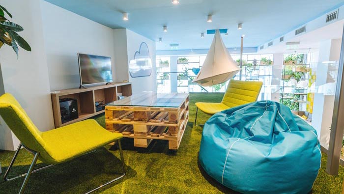 旅游門戶辦公室接待區設計:設計師在設計的時候,將休息、娛樂、觀賞、自然融入其中,在設計師看來此時的客戶更需要的時候一些娛樂活動,設計師希望讓客戶在此處仿佛置身于大自然一般,愜意、舒適、安逸。