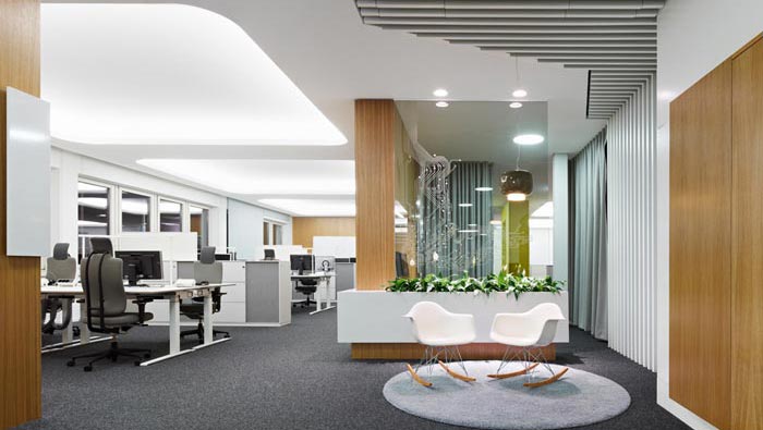 軟件公司辦公室入門區設計:設計師在設計的時候,對每一個空間都進行了無數次的搭配,在設計師看來一個設計的好壞,往往從細節上可以感覺出來,此處就是一個明證,一小塊圓形地毯+創意沙發就完成了一個區域的建立,真是讓人嘆為觀止。