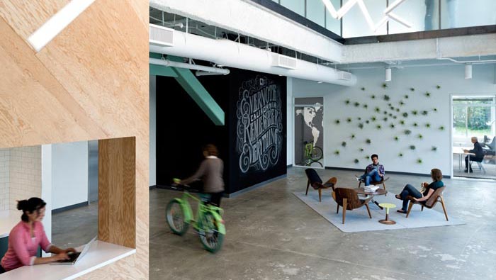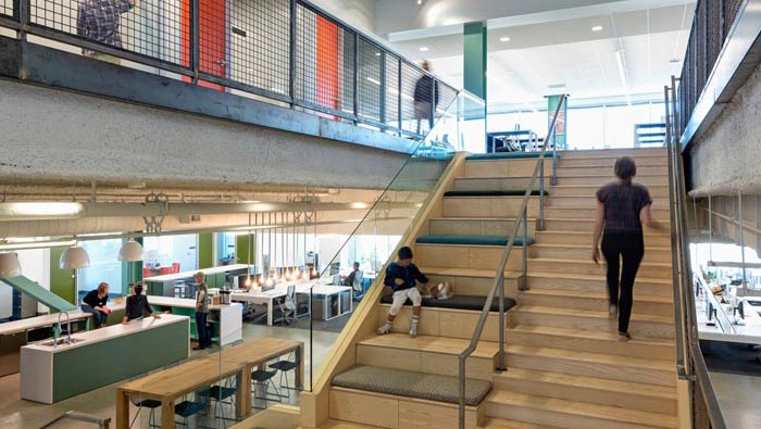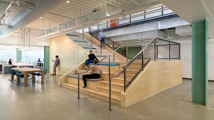 APP公司辦公室樓梯的設計:設計師在設計的時候,采用了一半走、一半留的原則,將整個樓梯劃分成兩個區(qū)域,為樓梯增加了新的屬性,在此處員工可以坐在上面無憂無慮的進行交談。