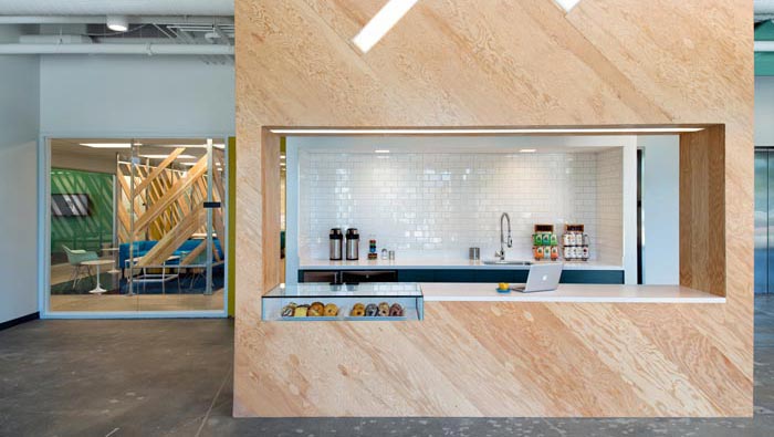 APP公司辦公室茶水間設計:設計師在設計的時候,將其與吧臺相互結合,并設置在進出辦公空間的必經之路上,這樣即方便待客也為配套設施的建設提供了便利,此處的設計以硬軟裝相結合的方式,既保證空間的建設,又保證容納能力的提升。
