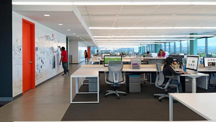 APP公司辦公室辦公區(qū)設計:設計師在設計的時候,將其安置在二樓區(qū)域,在設計中設計師采用開放式對空間進行設計,同時將辦公工位按照U型設計,這樣可以保證為每一個員工保留一片獨立的辦公空間,彌補開放空間的不足。