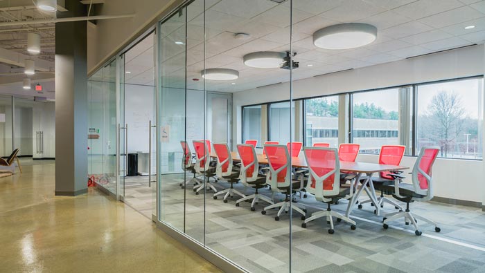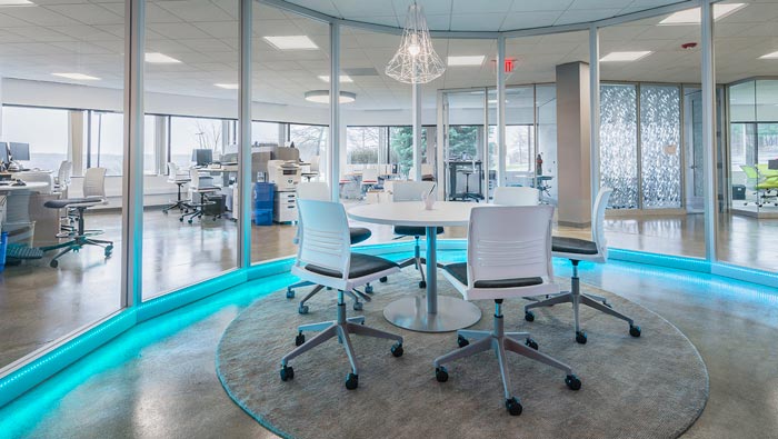 B2B公司辦公室會(huì)議室設(shè)計(jì):設(shè)計(jì)師在設(shè)計(jì)的時(shí)候,將自然光與人工光源進(jìn)行很好的結(jié)合,為會(huì)議的順利開展提供一個(gè)穩(wěn)定的空間氛圍,同時(shí)這樣的設(shè)計(jì)可以將此處空間與外部空間進(jìn)行有機(jī)結(jié)合,開拓大家的視野與思路得以擴(kuò)展。