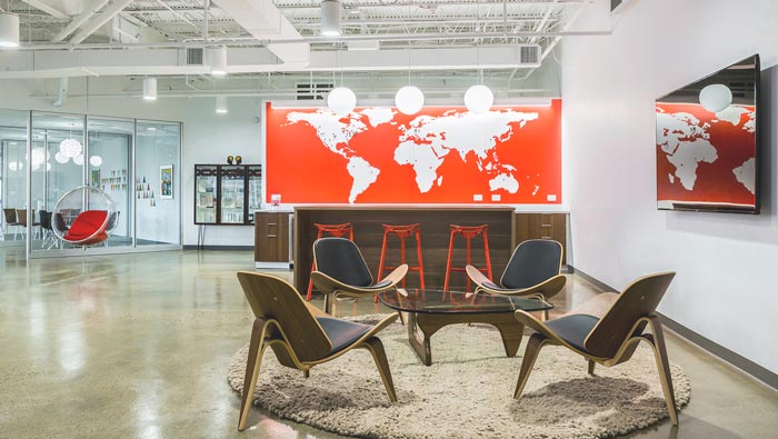 B2B公司辦公室交流區(qū)設(shè)計(jì):設(shè)計(jì)師在設(shè)計(jì)的時(shí)候,將其呈弧形設(shè)置在辦公空間的一側(cè),此地可以做為交流區(qū)域,設(shè)計(jì)師希望客戶在交流過程中不斷的了解企業(yè),這樣對(duì)于下一步的合作有著重要的促進(jìn)作用。