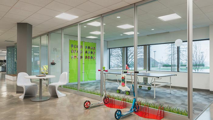 B2B公司辦公室玩耍區(qū)設(shè)計(jì):設(shè)計(jì)師在設(shè)計(jì)的時(shí)候,重點(diǎn)在于強(qiáng)調(diào)空間的活性與歡快的空間氛圍,故此設(shè)計(jì)師在選擇乒乓球桌的時(shí)候,采用折疊、可收縮、可活動(dòng)的樣式,玩耍可以增進(jìn)員工之前的友誼,合則讓空間保留了更大的可能性。