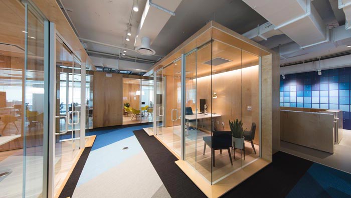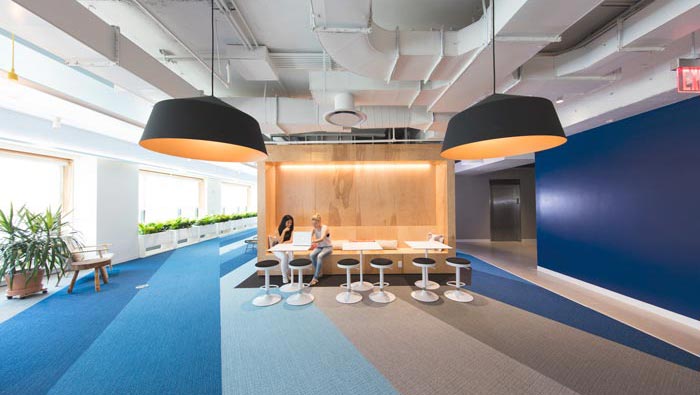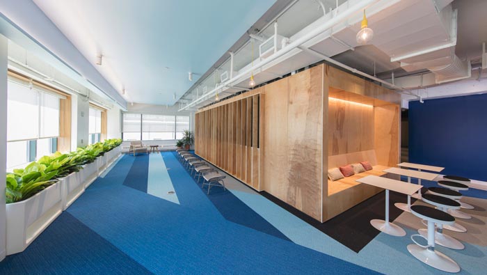 網絡公司辦公室動線設計:設計師在設計的時候,考慮到此處空間地處空間的內側,故此讓光源可以投入此處空間之中,動線的設計也采用不同的色彩進行表現,設計師希望通過這樣的設計增加空間的通暢與方便。