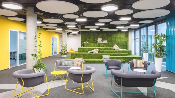 互聯網辦公室休息區設計:由于企業的屬性決定辦公室,對于人數的承載有很高的要求,設計師在設計中將座椅改成層級排列,這樣改變的目的就是不希望空間過于生硬,在設計師看來生活已經如此多艱,為何不給他們一個愜意的空間,讓他們投入自然的懷抱中,去傾聽自己的心聲。
