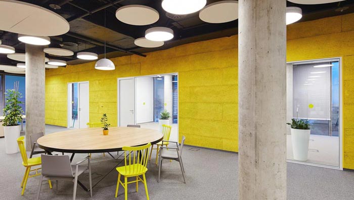 互聯網辦公室會議室設計:由于企業人數眾多,加上項目的不同,所以對于會議室的要求也十分之高,辦公區域與會議室由一條主動線連接,以此保證相互之間的配合,同時在會議室的設計上,設計師將大、中、小會議室安置在同一條直線之上,以此滿足各自的辦公需求。