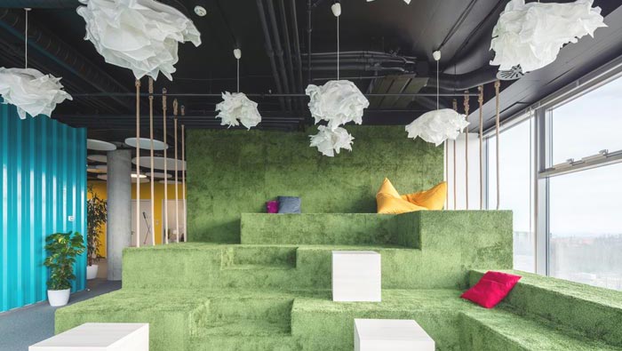 互聯網辦公室草坪區設計:設計師不希望美好的風景被浪費,故此將草坪安置在此處,員工在這里或躺、或坐、或休息、或遠眺,設計師希望給他們一個多元化的空間,讓他們從現實生活中脫離出來,去感受那被自己遺忘的美好,只有如此才能在以后的生活與工作中更進一步。