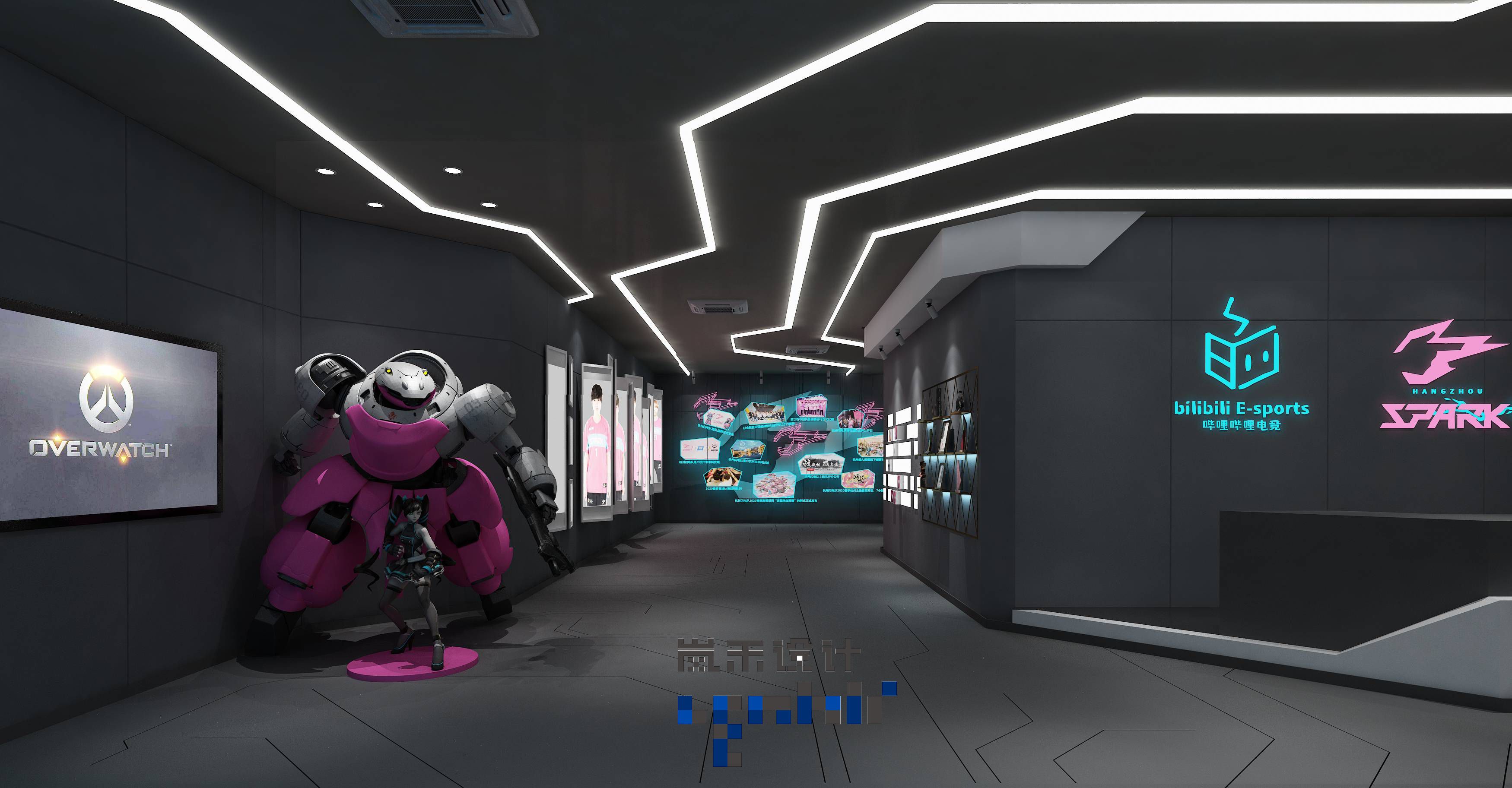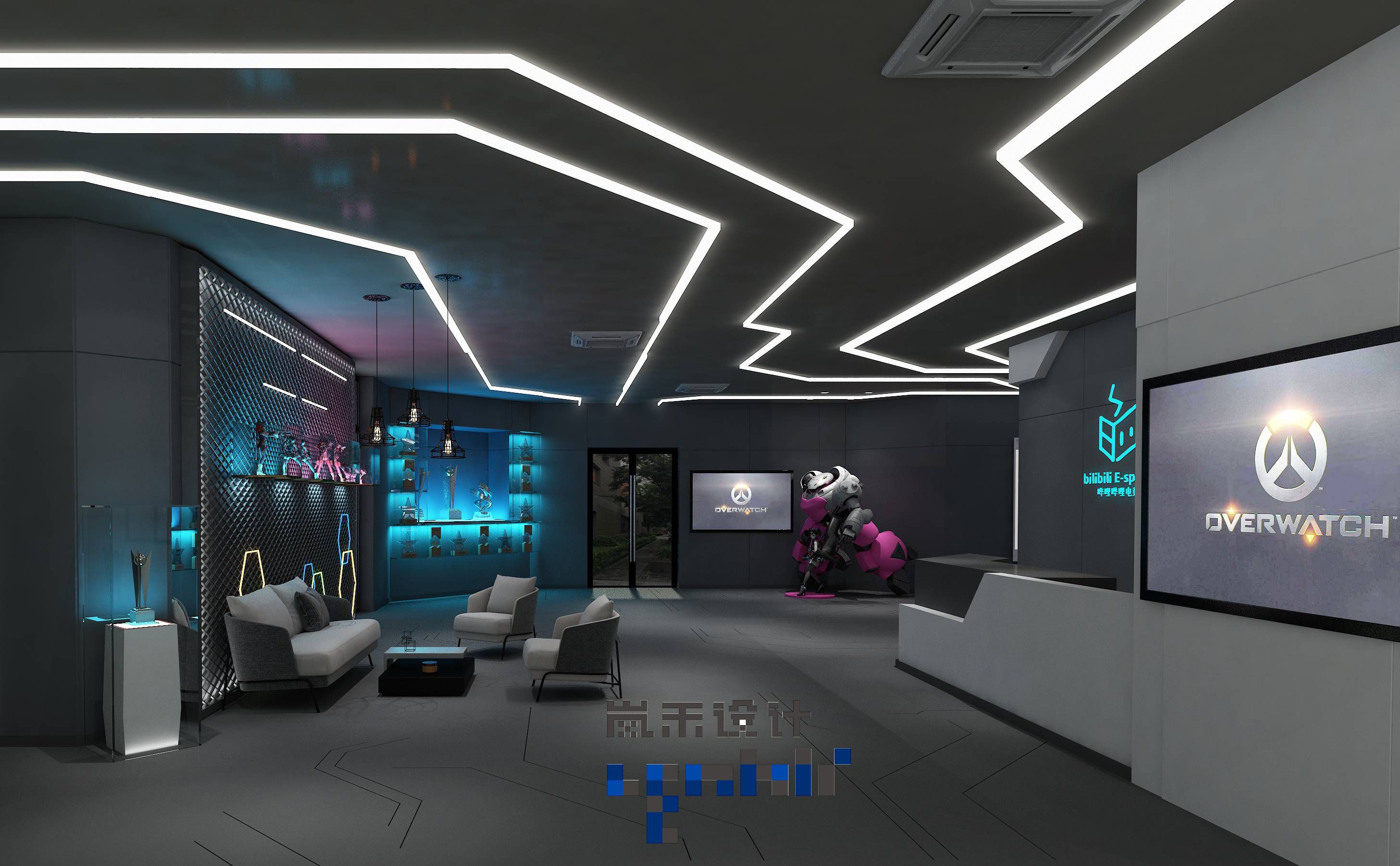 入口處掛滿了該公司的周邊,霓虹燈管互相交織在這片空間中,猶如夢幻與現(xiàn)實的交織讓人魂牽夢繞卻又讓人著迷。我時常會想,未來感是什么?當我看到這套效果圖的時候大概就能明白是什么了吧。