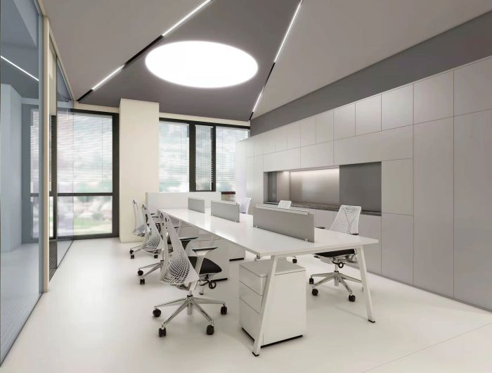 設計師將企業的logo進行解構重組,提取出視野、膠片等關鍵詞,融入與整個空間布局中。打造了一個現代簡潔的辦公空間。最大程度的保留了通透明亮的光照條件。