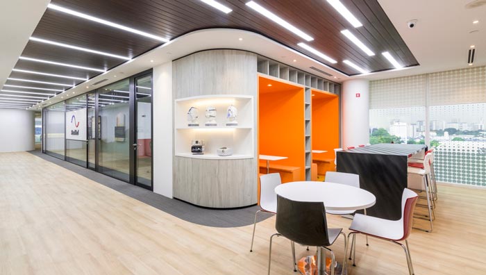 接待區(qū)域的設(shè)計:在此處的設(shè)計中,設(shè)計師采用了去前臺的設(shè)計手法,當(dāng)客戶進(jìn)入空間之后,可以直接通過動線進(jìn)入到接待區(qū)域,此處不僅是接待區(qū)域,同時也是員工的休息區(qū)域,所以此地的人絡(luò)繹不絕,這樣就起到了很好的接待作用,設(shè)計師希望讓企業(yè)的每一位員工,在工作的同時也可以與企業(yè)一同成長。