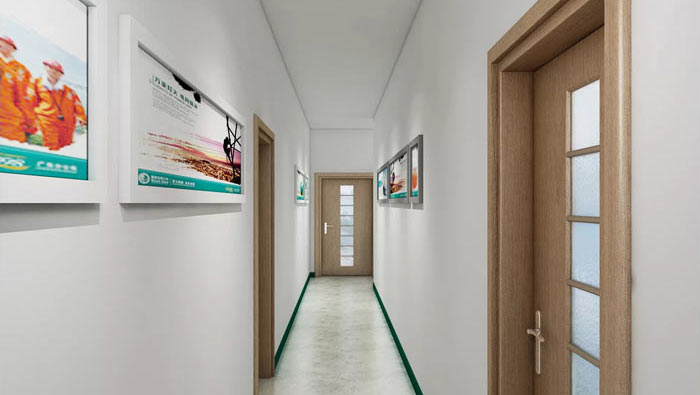 國家電網辦公室過道裝修:白色的墻體、木色的門框、綠色的踢腳線、墻體畫像的點綴,一切的一切是為了讓過道更加簡單、便捷。