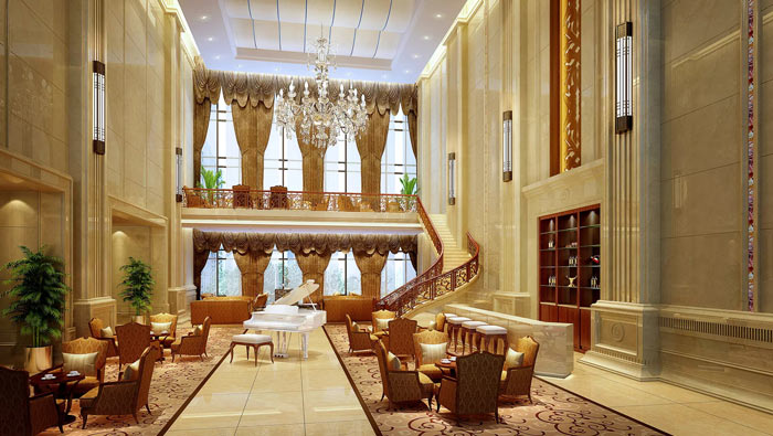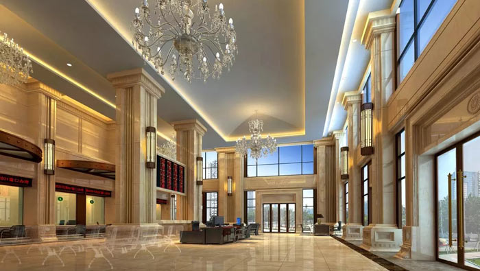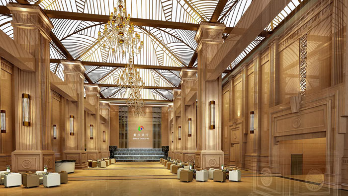 銀行寫字樓接待大廳裝修:接待大廳好似宮殿一樣,既滿足了企業實力的展現,同時也滿足了客戶對于企業的認知,宮殿本身就代表著實力,故此設計一舉兩得。