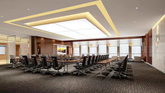 銀行寫字樓會議室裝修:會議桌有主會議桌、與副會議桌構成,主會議桌在中心區域,副會議桌依靠在主會議桌之后,這樣做的目的就是既滿足需求,同時擴大空間的容納。