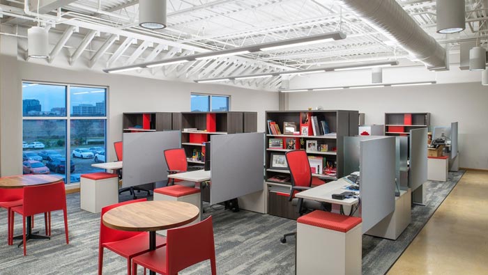 700平方辦公室辦公區設計:萬物集合起來就需要管理,那么企業的管理對象也是人,故此對于管理公司的管理來說,更能看出企業的實力,在設計中業主明確提出要打造一處人性化的辦公空間,給員工一個開放、獨立的空間,有了這樣的前提,設計師冥思苦想,最后以書架做為隔斷隔離每一個辦公區域,在每一個辦公區域之間為員工預留了足夠的活動空間,保證了開放中的個人空間。
