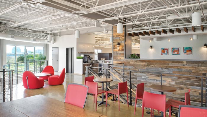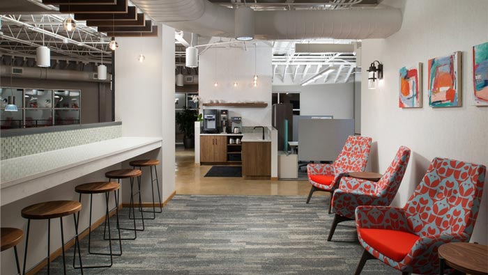 700平方辦公室交流區設計:此次設計師的希望就是打造一個多元化的空間,不僅針對企業內部、同樣針對與客戶之間的交流,在這里人與人之間的關系變得更加隨和,讓我們忘卻彼此的身份,在這里相互交流、相互攀談,以此使內部員工更快的融入企業,同樣更快的與客戶打成一片。