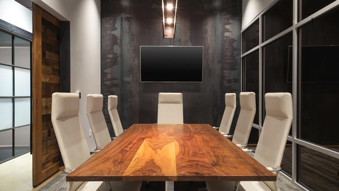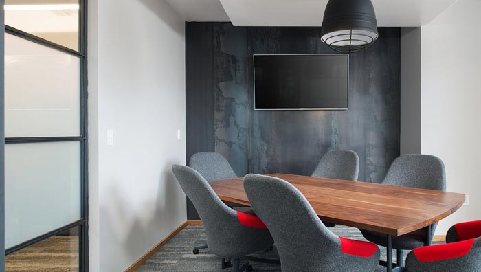 700平方辦公室會議室設計:此處的空間為長方形格局設計,設計師為了將空間的效果發揮到最大,故此采用移動式的設計,每一個會議桌下面有一個一個滑輪,合則形成大會議室、分則各自為戰,這也是設計師對此處的詮釋,同時此處與落地窗相鄰,白天時陽光照入室內,讓整個空間明亮無比,當黑夜襲來的時候,空間變成了一個暗色系的空間,不同的情景給以不同的場景。