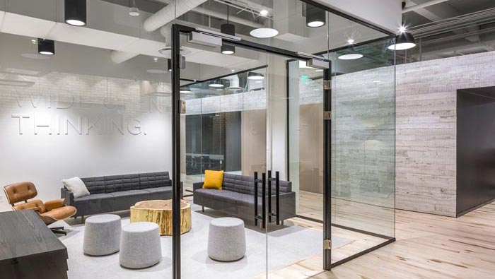 800平方辦公室進門區(qū)設計:設計師將接待區(qū)域單獨布置在一個空間之中,目的就是為了強調(diào)空間的獨立性,客戶進入室內(nèi)后,前臺人員將其引入接待區(qū)域稍作休息,業(yè)務人員由外向內(nèi)進入接待區(qū)域,兩邊互不影響、又相互配合,保證了空間的暢通與辦事效率的提升。