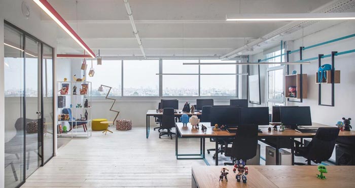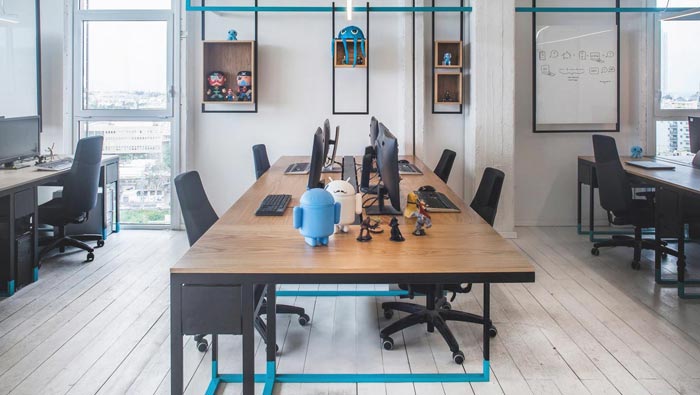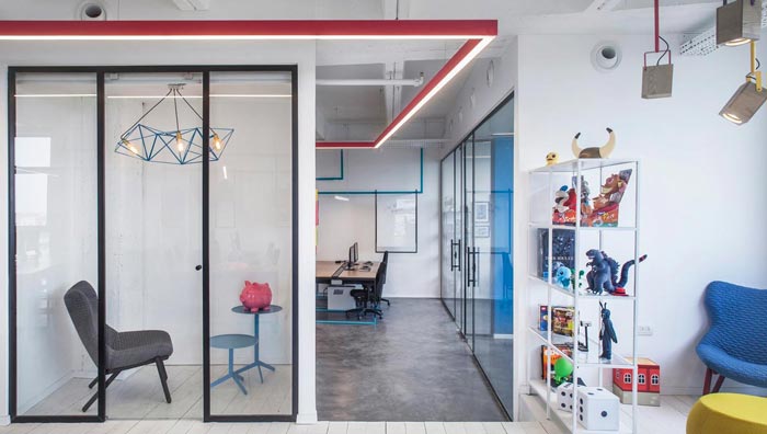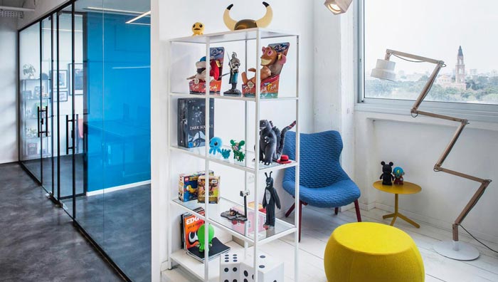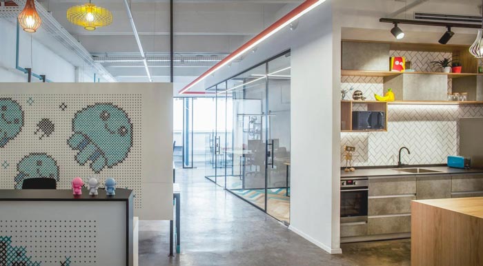 260平方辦公室辦公區設計:異形的辦公桌,可以打破空間中規中矩的感覺,雖然只是桌底一點點的異形,但是也讓空間的形象截然不同,每一個辦公桌都差不多多出來將近20公分,目的就是擺放各種各樣的游戲模型,讓員工在勞累的時候可以養神、養眼。