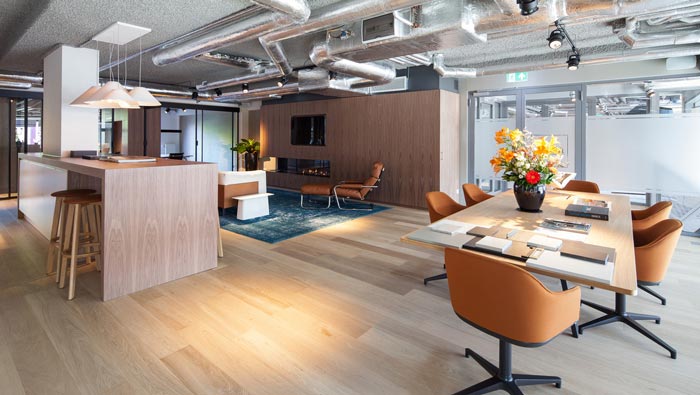 進門區域的設計:當客戶進門后首先感受到的就是溫馨與舒適,這也正是設計師希望看到的,因為在設計師看來,由于行業的不同辦公室的屬性也在發生改變,對于房地產開發商來說,設計師認為取得客戶的好感與信任至關重要,故此設計師從每一個細節入手,讓客戶感受到企業的活力與理念。