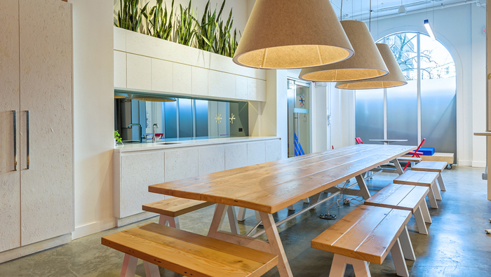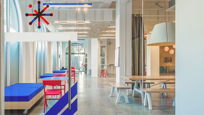 交流區域的設計:當桌椅收攏起來之后,此處空間就擁有了更多的可能,這也是設計師設計的初衷,椅子被懸掛在墻體之上,儲藏柜按照層級依次向上,一方面可以在此處休息,另外一方面也為掛取椅子提供了保障,可折疊的桌子以此排列在儲藏柜的左側,當桌椅被收攏之后,被設計師巧妙的設計為空間的點綴物。