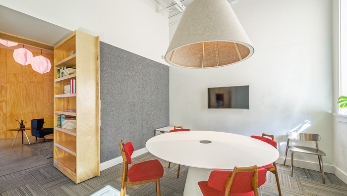 小型會議室的設計:我們首先看到的就是一個機關門,在外看是一個書架,往內推開卻是另有一番天地,這也是設計師設計中的一點點小趣味,在設計師看來趣味是辦公中的調劑,設計師希望員工在辦公中不是一成不變的,而是幽默、活躍、有趣。