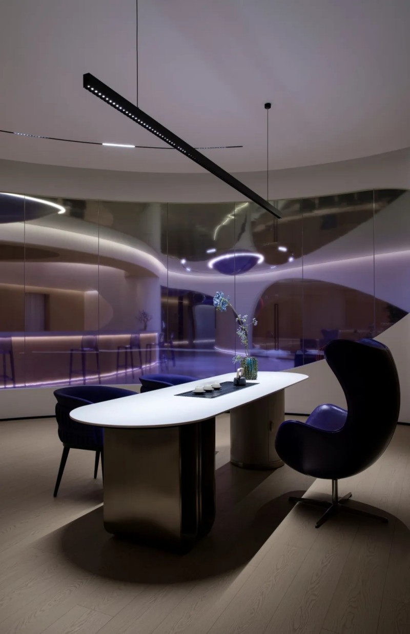 整個空間選擇了蒼藍為主色,靈感來源于對葉博士沉著和冷靜的第一印象。設計師覺得,這是符合對方氣質的空間色彩。也因為在廈門這個海濱城市,蒼藍是海天一色交融時獨有的一道藍紫色。