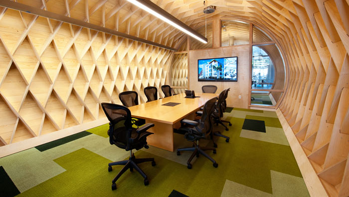 會議室裝修設計效果圖:空間由一個圓組成,在圓之下空間由一個個的小型四邊形組成,一個支撐著一個,好似員工一樣,每一個員工代表著一個小型四邊形,承擔起企業的發展。
