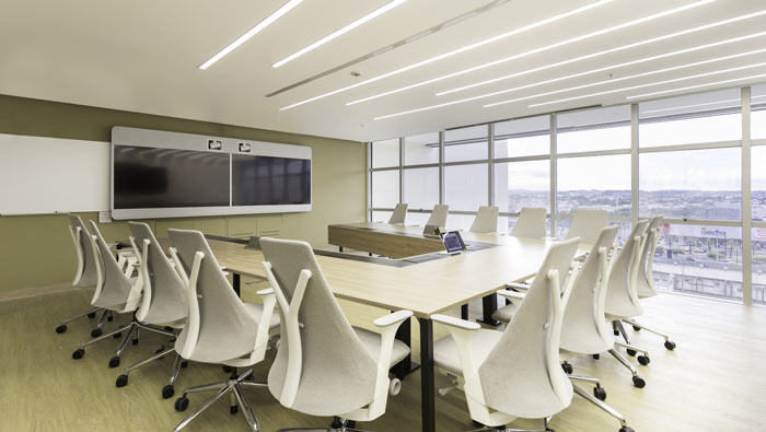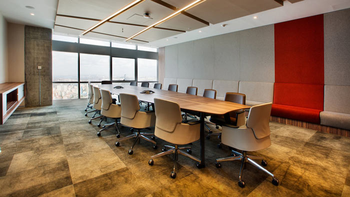 會議室設計方案:空間可以容納將近30個人,會議桌可以容納16個人,邊緣沙發可以容納十幾個人,設計師要做的就是在滿足企業需求的同時,將空間開發到最大化。
