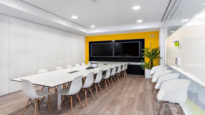 會議室設計方案:會議桌的擺放位于空間的偏左側,這樣設計的目的就是為了容納更多人,會議桌可以容納11個人,右側可以容納5個人,這樣設計后容納能力顯著提升。