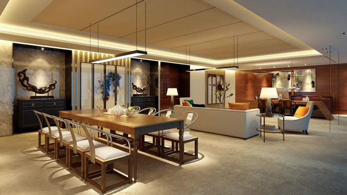 經(jīng)理辦公室設(shè)計:此處空間運用的是新中式風格,設(shè)計師希望的就是在心靈與需求之間尋求平衡,為總經(jīng)理打造一個凈化心靈、滿足需求的雙重屬性辦公空間。